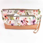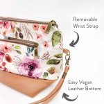 14" long, 7" tall, and 6.5" deep, includes a 5" wrist loop.Cotton Canvas upper and lining, with vegan leather bottom. Zippered top and zippered exterior pocket.